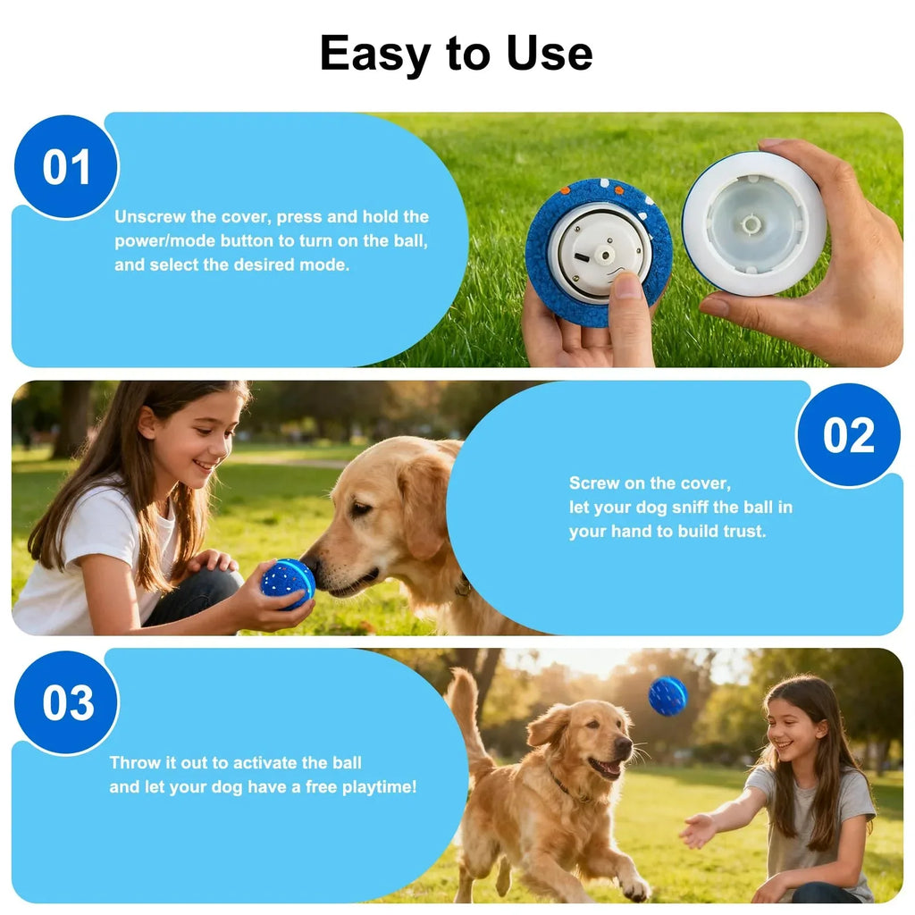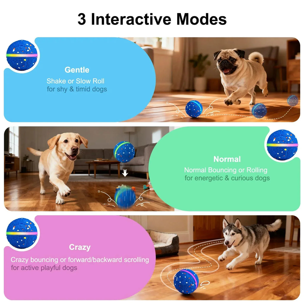 • Gentle Mode: Rolls slowly, perfect for introducing the toy to shy dogs.